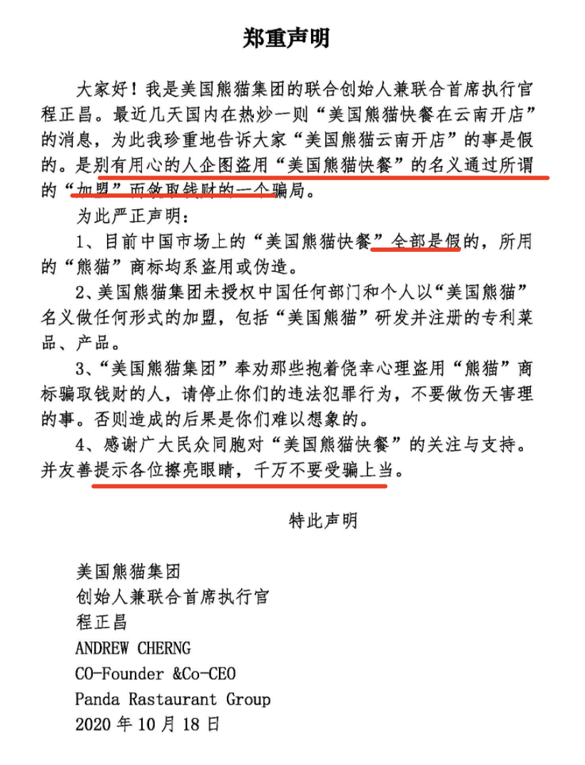 Panda Express in Yunnan is fake...the Panda Restaurant Group, Inc. in the US has not authorized any departments or individuals in China to join in any form under the name of ‘American Panda.”