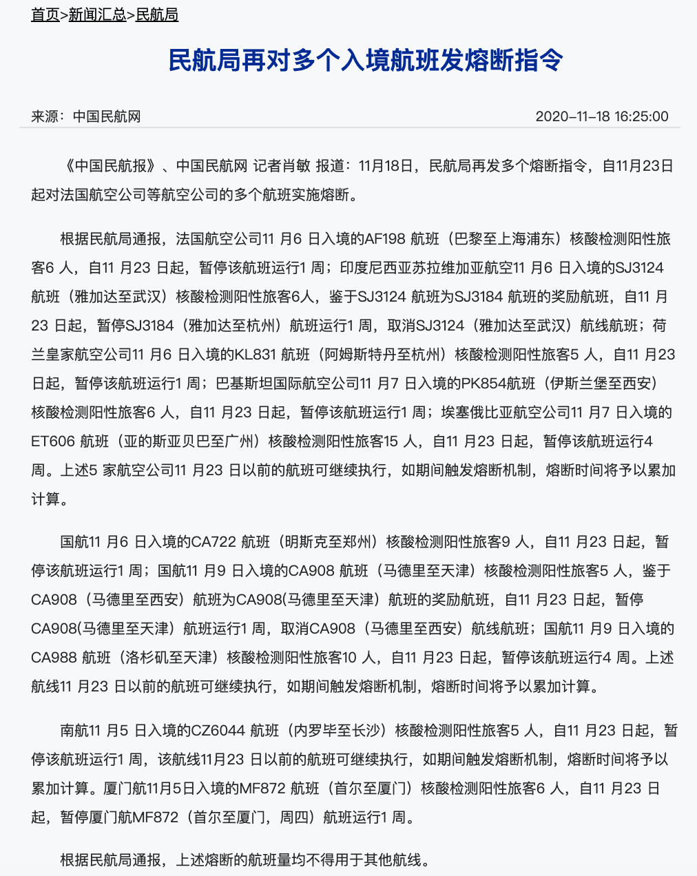 11月23日起,法国航空:巴黎-上海浦东,暂停1周;印尼苏拉维加亚航空:雅加达-杭州,暂停1周;雅加达-武汉,取消;荷兰皇家航空:阿姆斯特丹-杭州,暂停1周;巴基斯坦国际航空:伊斯兰堡-西安,暂停1周;埃塞尔比亚航空:亚德斯亚贝-广州,暂停4周。