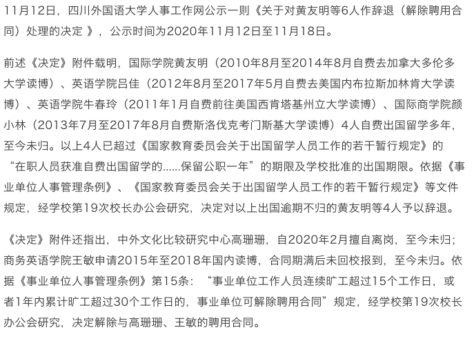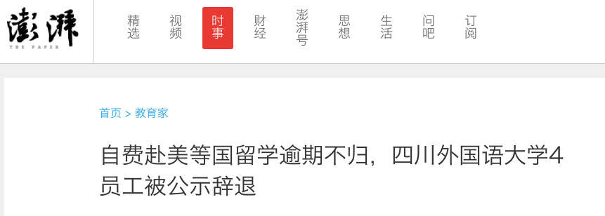 根据澎湃新闻报道,最近川外一批赴美留学但是没有按时归来的员工已经被请辞。
