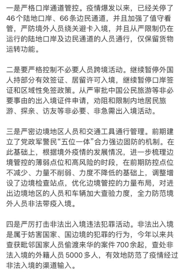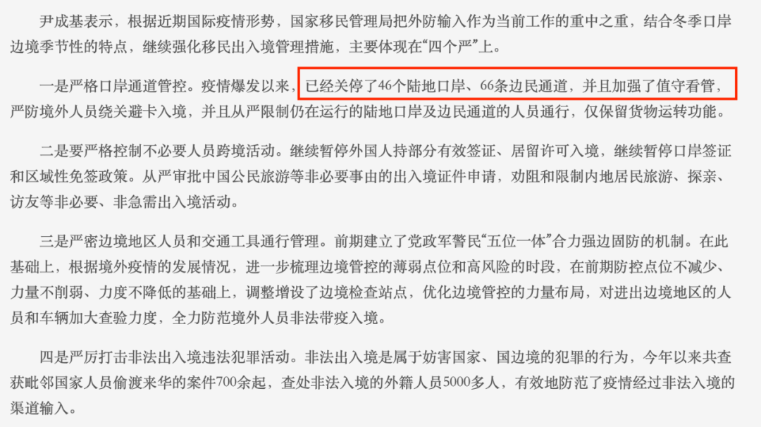 此外,自从疫情爆发以来,中国已经关停了46个陆地口岸、66条边民通道,并且加强了值守看管,严防境外人员绕关避卡入境,并且从严限制仍在运行的陆地口岸及边民通道的人员通行,仅保留货物运转功能