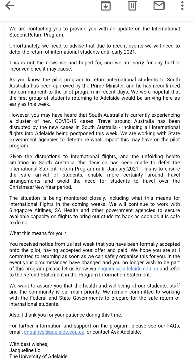 刚刚,阿德莱德大学发送了邮件,表示:试点计划将推到明年1月进行!
