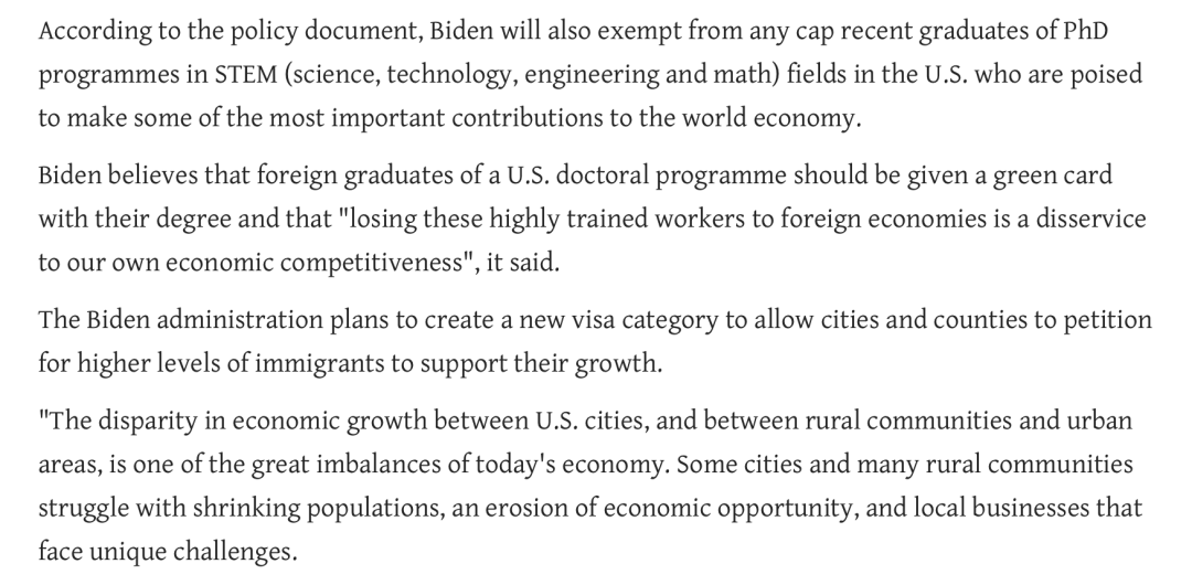 拜登此前已明确表示,将给在美国攻读 STEM (科学、技术、工程和数学)类理工博士学位的外国毕业生直接发放绿卡,取消其配额限制。