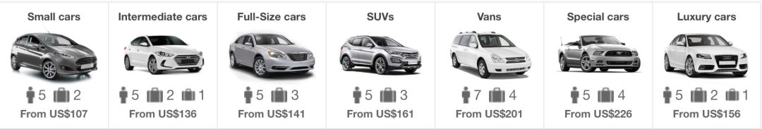 经济型轿车、紧凑型轿车、中型轿车、标准轿车、全尺寸轿车、中等SUV、标准SUV、全尺寸SUV和7座商务车。