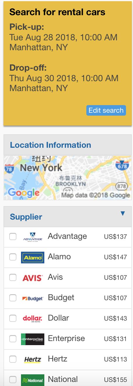 把地址改为曼哈顿,会发现租车价格有所变化: