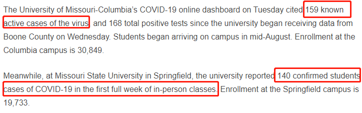 而这样的情况还不是少数,美国多所院校都出现了校园感染情况: