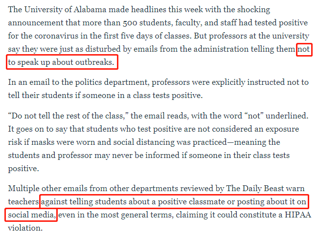 WTF?大学教授竟被学校要求“封口”!而事情是这个样子,阿拉巴马大学在开学5天就出现了500多人感染新冠的情况,而如今复课近半月已超一千例病例,成了全美感染数最多的学校...