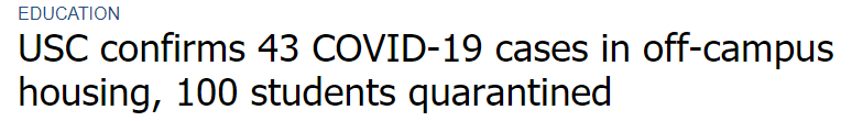 而USC秋季课程刚过一周(大多数还是线上),出现的43例校外病例,追源头也有可能是校外聚众开Party导致的...