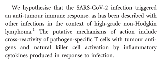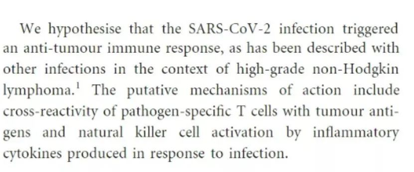 《英国血液学杂志》因此做出了这样的猜想:该男子在感染新冠之后,新冠病毒进入到了他的体内,这就刺激到了该男子的免疫系统,触发一种抗肿瘤免疫反应!