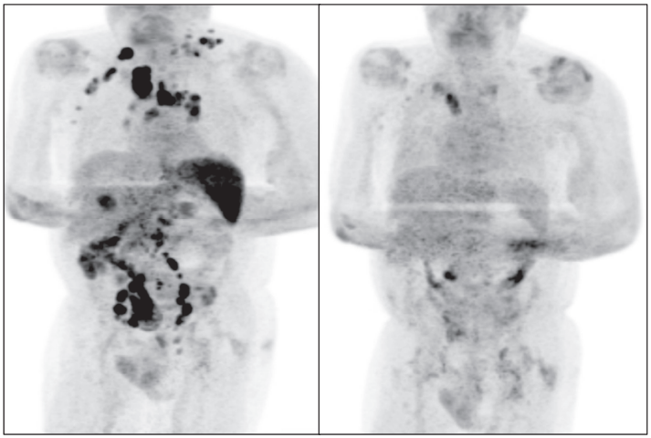 CT检查照片显示:可触及的淋巴结病变减少,淋巴结病变广泛消退,整个区域的代谢摄取减少。