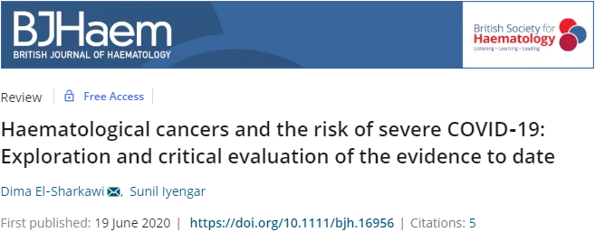 2020年6月,同样发表于BJH的一篇文章曾经回顾了迄今为止有关血液癌患者感染新冠病毒后发生并发症的证据,并提出由于免疫力下降,血液癌患者可能会在感染SARS-CoV-2后遭受更严重的临床结局。