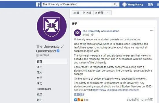 图源:昆士兰大学Facebook主页声明