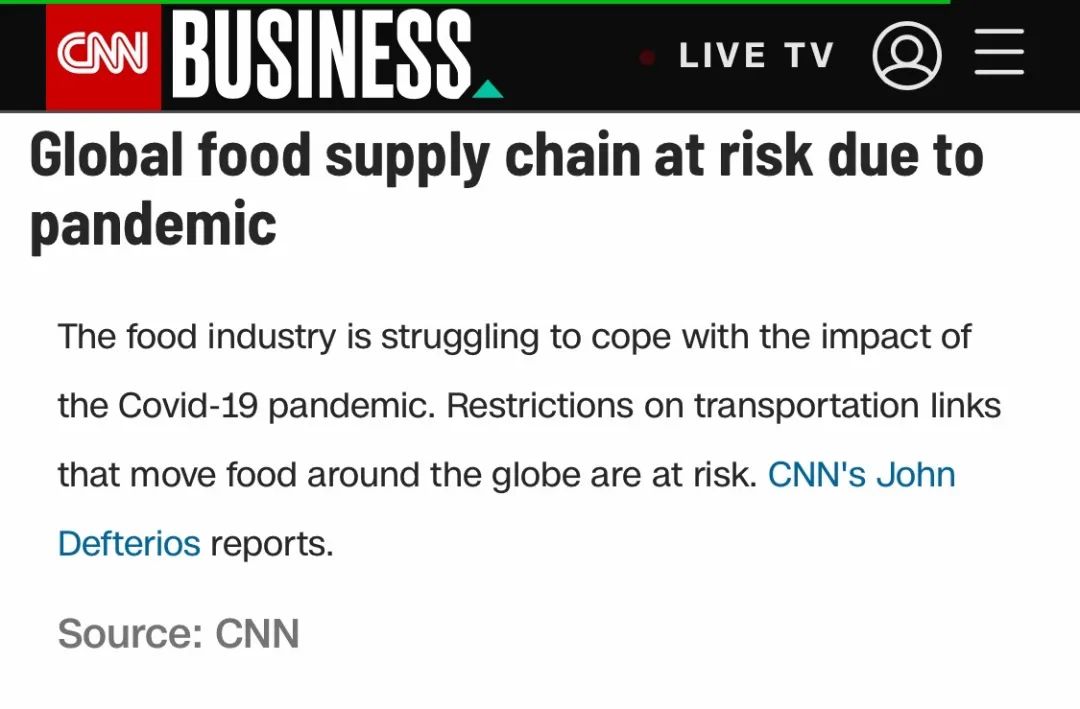 全球供应链现在已经遭到了打击,一方面是各国的进出口限制,另一方面是因社交距离引起的人力问题,而食物的保质期短,说不定在出口的半路就已经夭折了…