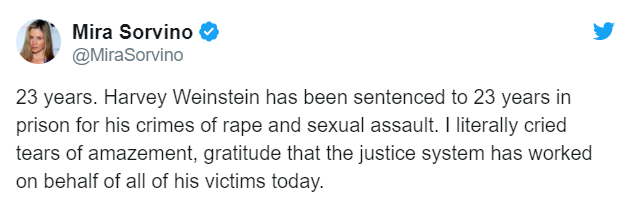 在知道韦恩斯坦被判处了23年后,女星米拉·索维诺说:“ 我哭了,感激司法系统为所有受害者正名。”