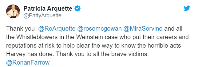 演员帕特丽夏·阿奎特说:“感谢这些女性将职业和声誉置于危险之中,以帮助大家清楚了解到,韦恩斯坦做的那些可怕行为。”
