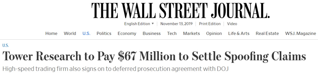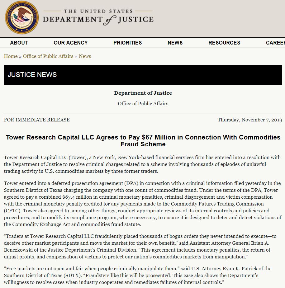 据美国司法部的公开信息称,位于纽约的金融服务公司Tower Research Capital LLC已与美国司法部达成一项决议,以解决一项涉及到美国商品市场上成千上万次的非法交易活动的刑事指控