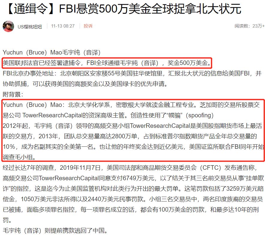 在微博网友@US樱桃妞妞的文章中,曝出“美国联邦法官已经签署逮捕令,FBI全球通缉毛宇纯(音译),赏金500万美金。