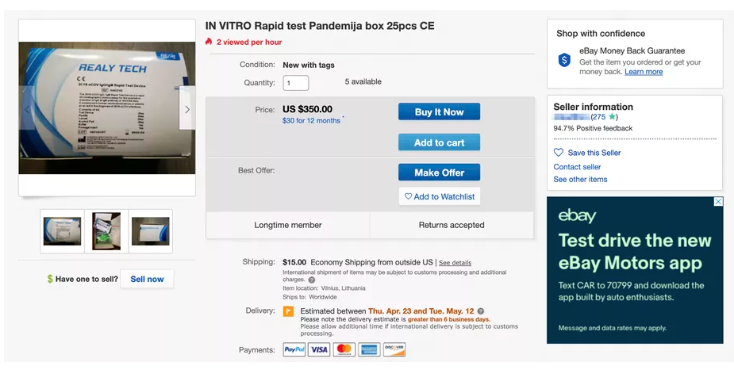 网络上兜售的假新冠肺炎检测工具包,要价350美元
