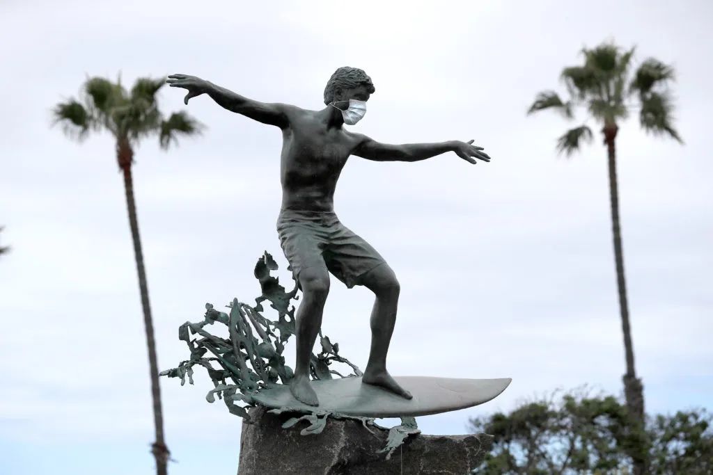 加州 Cardiff by the Sea的冲浪雕像戴上了口罩