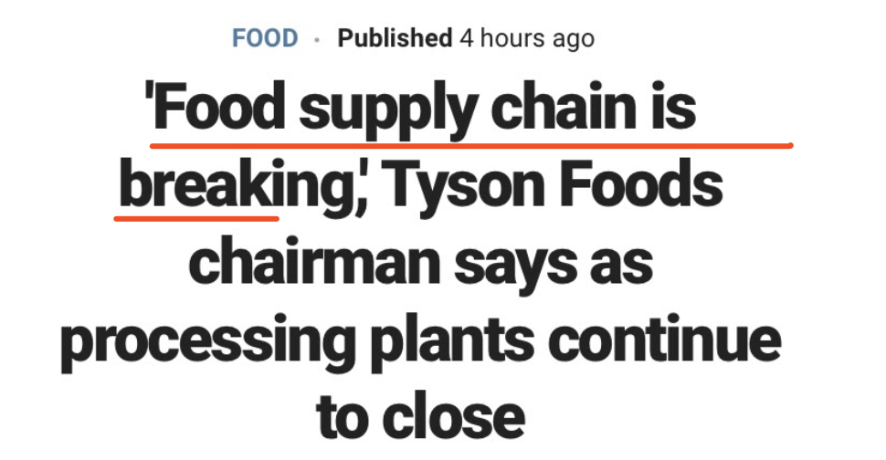 美国最大的肉类加工商泰森食品(Tyson Foods)周一(4月27日)发布了一份警告性质的声明::食品供应链正在崩塌。