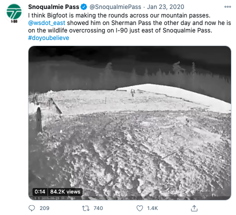 当时,道路上的监控捕捉到了这一幕——一只看似“大脚怪”的生物,迈着大步前进。华盛顿州的斯诺夸尔米山口(Snoqualmie Pass)也发布了官方推特并配有这段监控录像:“看似大脚怪正在穿越我们的山口!#你相信吗?