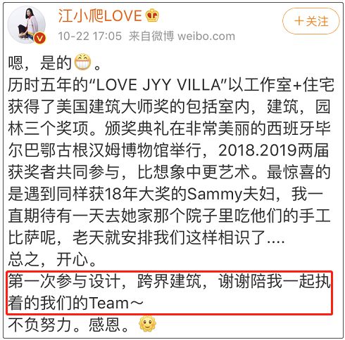 并称这是自己“第一次参与设计,跨界建筑”,同时,也不忘感谢自己的团队,“谢谢陪我一起执着的我们的Team~”。