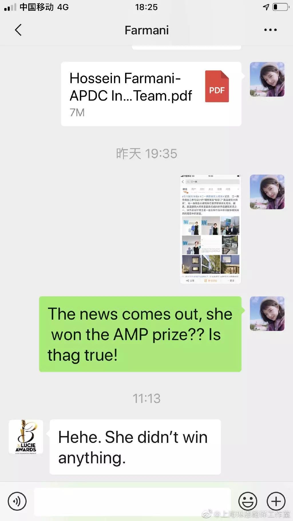 更打脸的是,@上海琳恩翻译工作室正巧和这个美国建筑师大奖是合作关系,他们的工作人员还特地去求证了这个奖项的创始人Farmani。