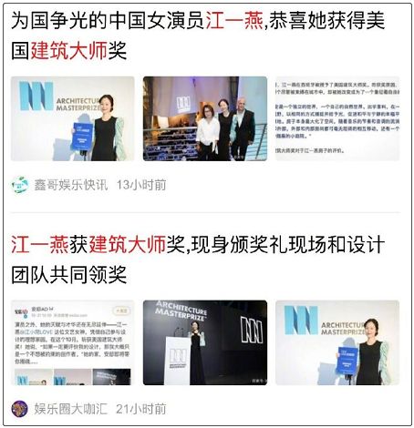 看到这样的通稿、这样的微博、加上C位领奖的照片,相信大多数人都会觉得这确实是江一燕获得了建筑师大奖。