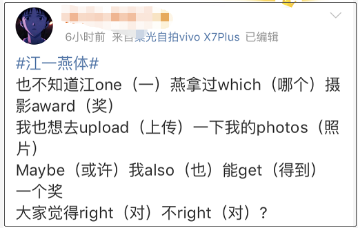 而这个#江一燕体#说白了就是说话中英夹杂的太刻意太做作。