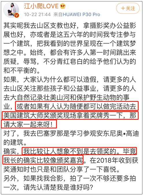 第二天,江一燕也发了一条微博,作为对这些通稿的回应,直接认下了这个奖项,“嗯,是的。”