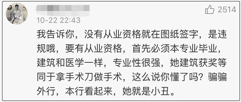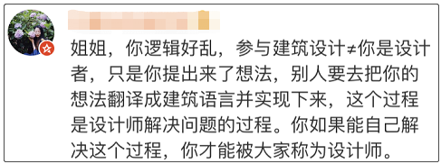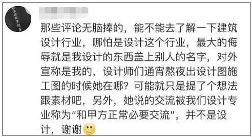而这一点,也是建筑设计专业的网友们对她提出质疑很重要的一点,作为甲方,提提要求不算啥,要能把想法翻译成建筑语言并实现,这个才是设计师!