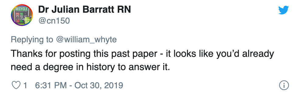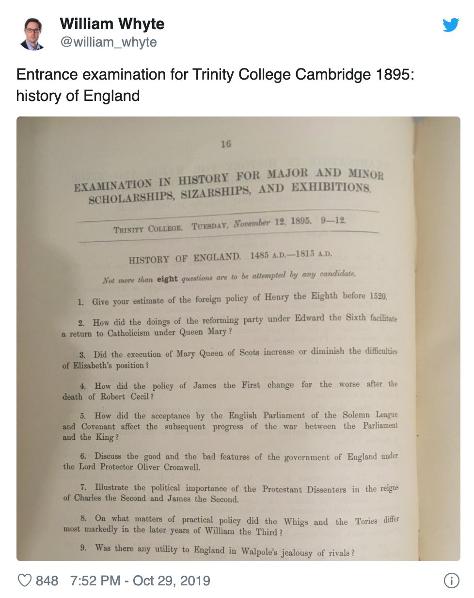 而网友们如此水涨船高的热情也是因为,剑桥的“死对头”,牛津大学的社会与建筑史教授,威廉·怀特也在推特上分享了这份入学考试题!