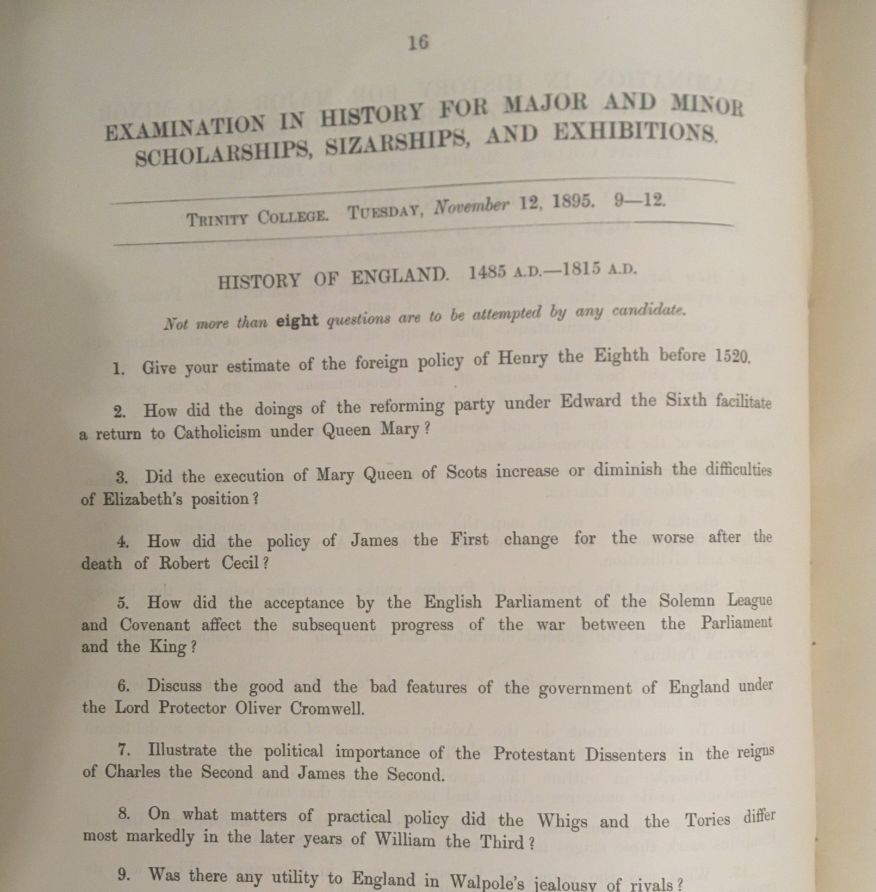 考题只是入学考试卷的一部分,测试的是1485年至1815年间的英国历史知识,它虽然包括12个不同的问题,但建议学生回答的问题不要超过9个。