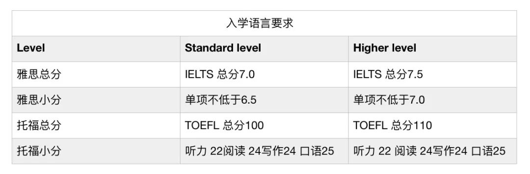 除此之外语言要求上通常需要雅思达到7.0分-7.5分,托福成绩则需要达到110分且单项不低于25分。