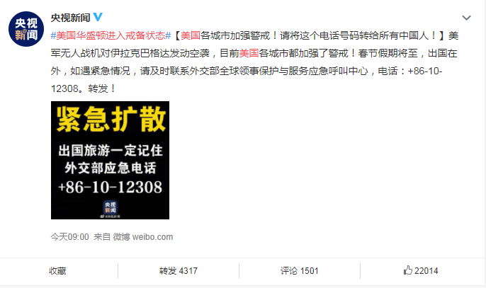 央视新闻也发文呼吁在美的中国人都要注意安全,遇到紧急情况及时联系外交部应急电话:+86-10-12308