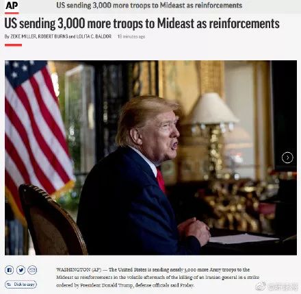 苏莱马尼被美军空袭身亡后,美国防部官员透露,五角大楼将向中东地区增派约3000陆军士兵,以应对海湾地区的紧张局势。
