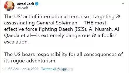 伊朗外长扎里夫随后也在推特上发声,指责美国在搞“国际恐怖主义”。他说,美国跟踪和刺杀苏莱曼尼的行为系“国际恐怖主义”,而后者在打击IS、“基地”组织方面系中坚力量,“这是一种极端危险、愚蠢恶化局势的行为”。扎里夫警告美国:一切后果自负。