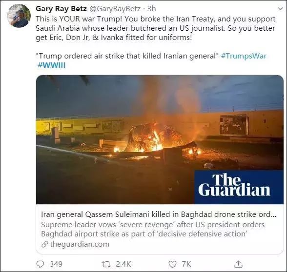 还有人训斥特朗普:“这是你一个人的战争!是你退出了伊朗核协议,是你支持虐杀美国记者的沙特。所以你最好送自己的孩子埃里克和伊万卡上战场!”