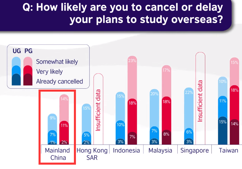 在9000份调查问卷中,仅有1%的中国学生表示自己已经选择了延期或取消留学计划。