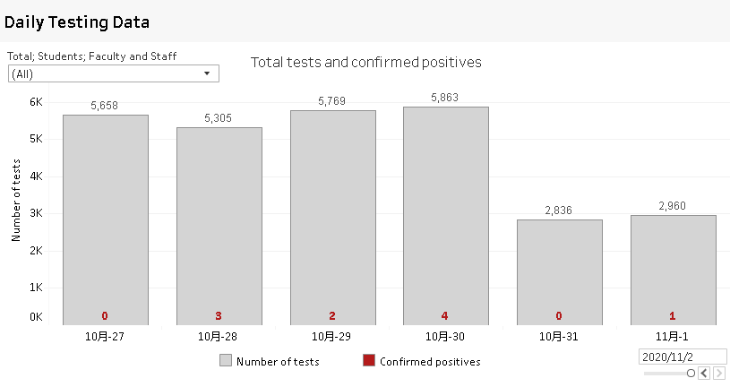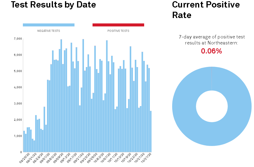 自本学期开始,东北大学已完成了320,764次测试,发现165个阳性结果——135个学生,30个教职工,相当于秋季学期测试阳性率仅为0.05%