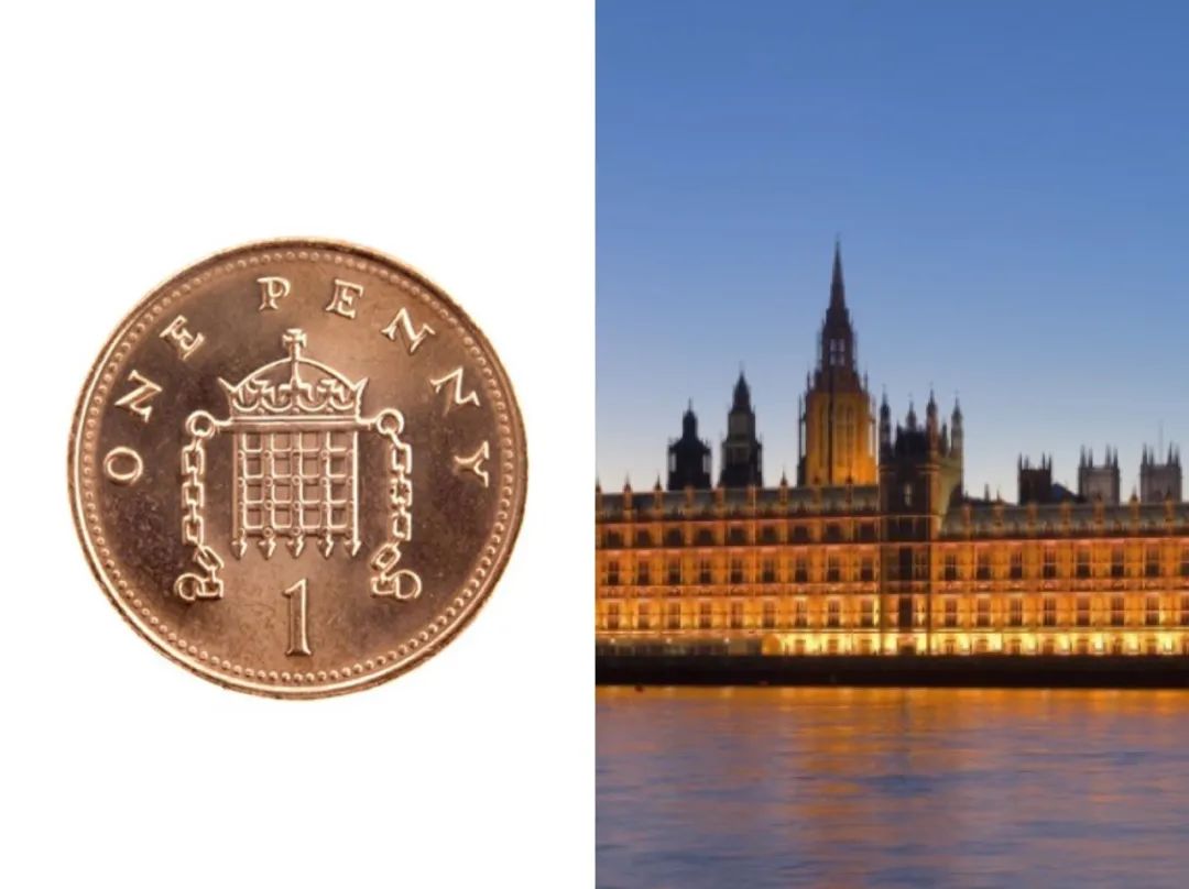 1p 上像闸门一样的东西是 Westminster Palace (又名国会大厦)的抽象化图案,代表议会的象征。