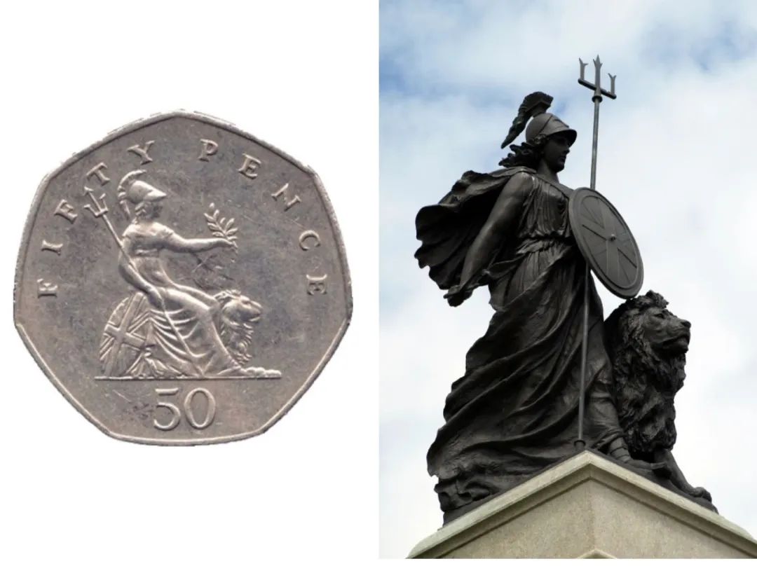 50p 上刻着不列颠女神与狮子,不列颠尼亚 Britannia 是罗马帝国对英国的称呼。