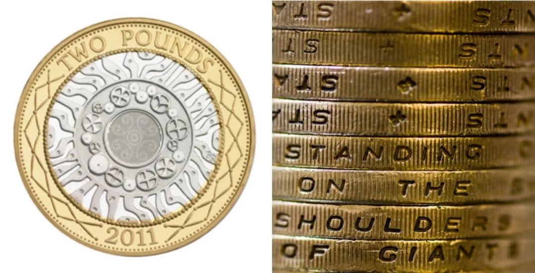 边缘刻字则是牛顿名言 Standing on the shoulders of giants (站在巨人的肩膀上)。