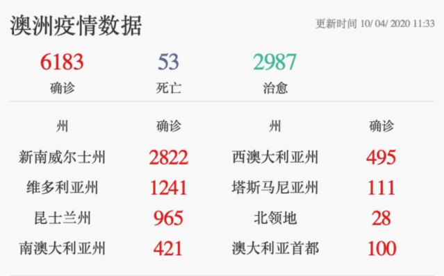 4月10日,澳洲最新确诊案例总数为6183,相当于只新增了74例!再创新低。而且,注意了!治愈数竟高达2987,相当于有近半的人已经治愈!