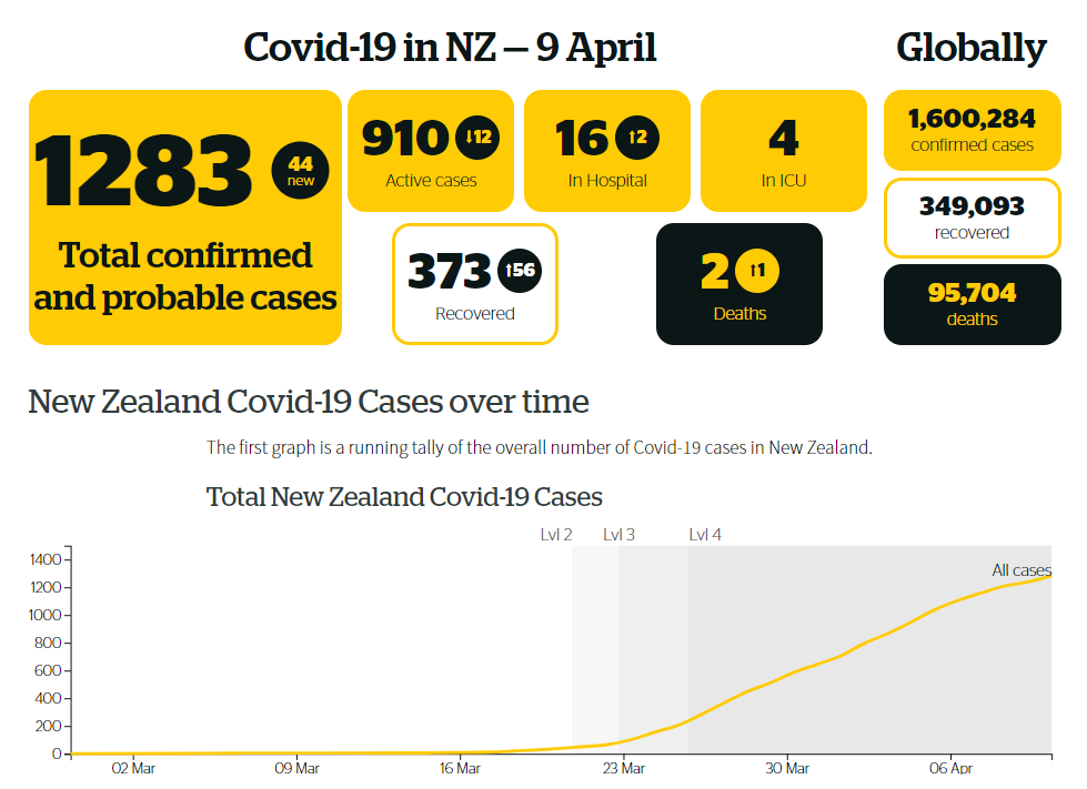 截至今日,新西兰总共只有1283名确诊案例,在住院的人只有16人。死亡人数更是低至一位数——2人。