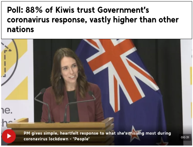 同时,一新西兰的最新民调显示,新西兰民众对领导新西兰的女总理和工党的防疫感到满意。对政府的信任度从53%飙升至88%!!