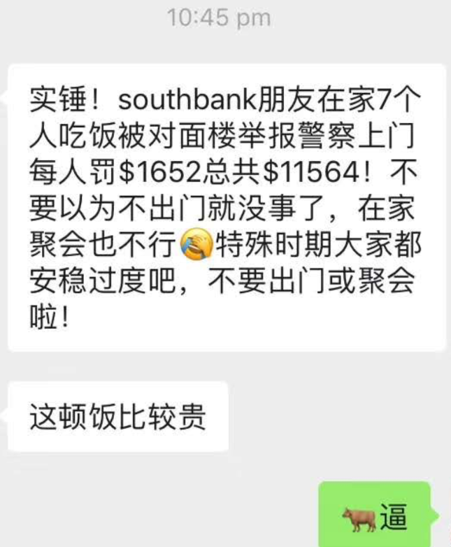 她们共7人,都因违反社交疏离令,每人被罚$1652元罚单,总罚金高达$11564澳元,约合人民币51776元。这一顿饭,吃的是真金白银。